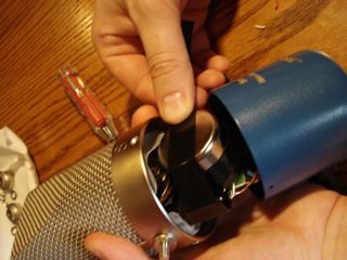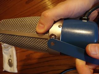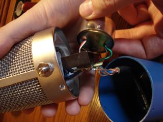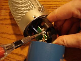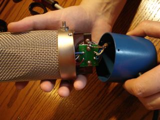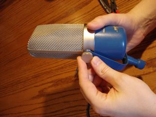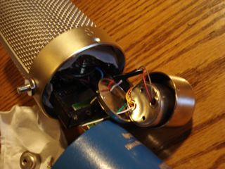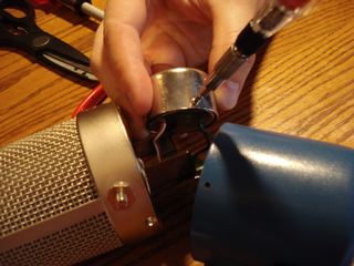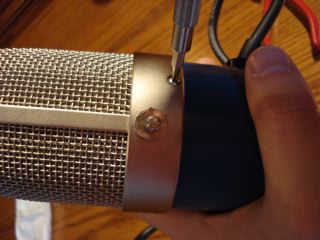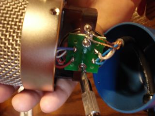 There are three screws around the mic. Unscrew them to remove the blue base of the mic.